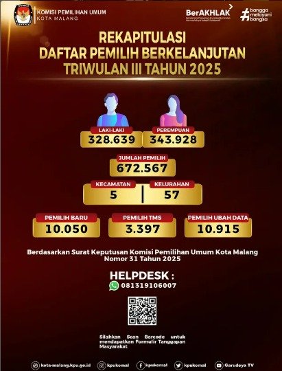 Berikut disampaikan Rekapitulasi Daftar Pemilih Berkelanjutan Triwulan III Tahun 2025 berdasarkan Surat Keputusan Komisi Pemilihan Umum Kota Malang Nomor 31 Tahun 2025 dapat di unduh di tautan berikut DPB TW III 2025