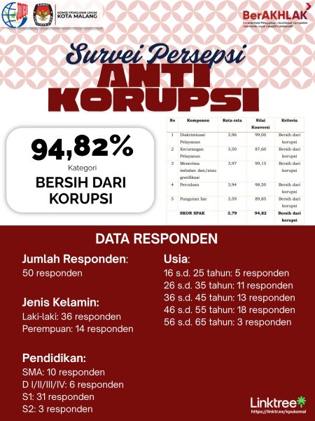 Berdasarkan hasil survei yang melibatkan 50 responden, diperoleh nilai Indeks Persepsi Anti Korupsi 94,82% dengan kategori Bersih dari Korupsi.