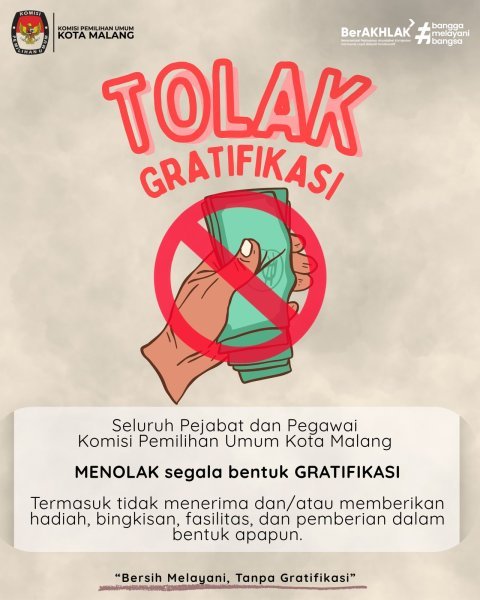 Bantu kami untuk mewujudkan KPU Kota Malang sebagai institusi yang bersih dari korupsi, serta menjadi birokrasi bersih melayani. Segera laporkan apabila menemui pegawai KPU Kota Malang yang meminta dan atau menerima barang/uang/fasilitas apapun yang tidal semestinya melalui tautan berikut PENGADUAN MASYARAKAT. serta nomor +62 812 3450 7056 atau melalui email dumaswbi657998@gmail.com