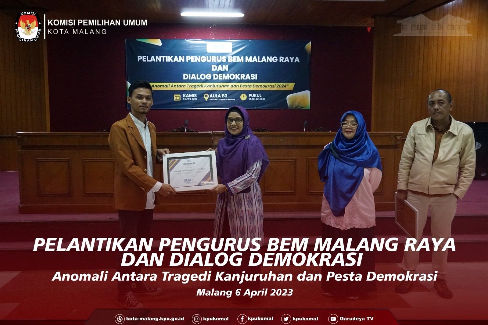 Bertempat di Aula B3 Universitas Negeri Malang pada Kamis (06/04/2023) Badan Eksekutif Mahasiswa Malang Raya menggelar Pelantikan Pengurus BEM Malang Raya yang kemudian disambung dengan Dialog Demokrasi yang dihadiri oleh Ketua KPU Kota Malang - Aminah Asminingtyas sebagai salah satu narasumber.