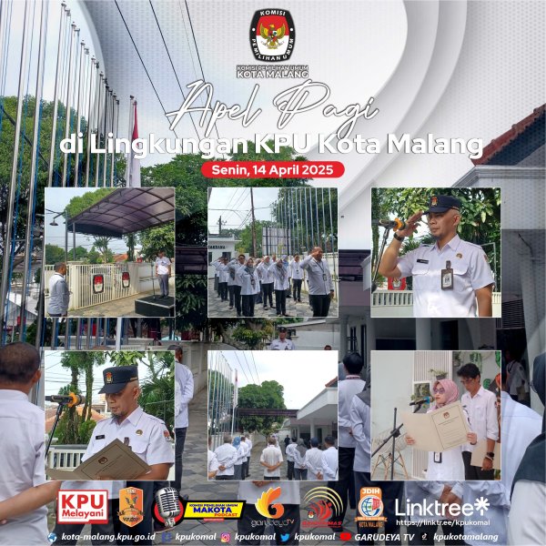 KOTA MALANG, kota-malang.kpu.go.id - Apel pagi yang dilaksanakan pada Senin, 14 April 2025 ini adalah sebagai bagian dari budaya kerja, sebagai wujud kedisiplinan, tanggung jawab, dan juga semangat kebersamaan dalam membangun lembaga yang kredibel dan terpercaya di mata publik. Sebagai lembaga penyelenggara pemilu, kita memiliki tanggung jawab besar dalam menjaga integritas dan profesionalitas. Tahapan demi tahapan telah kita jalankan dengan penuh kehati-hatian, sesuai dengan prinsip-prinsip demokrasi dan regulasi yang berlaku.