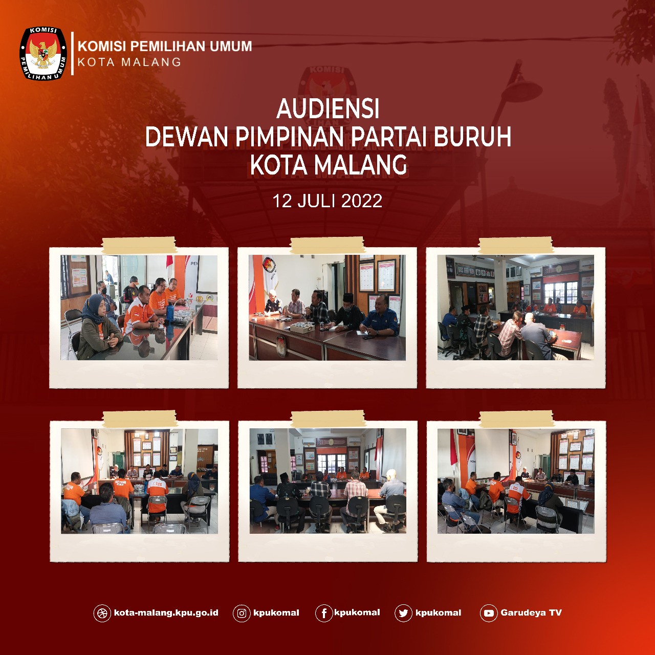 Dalam rangka silahturahmi dan Diskusi Tahapan Pemilu tahun 2024 Perwakilan Komite Eksekutif Partai Buruh Kota Malang mengadakan Audiensi kepada Komisi Pemilihan Umum Kota Malang pada Selasa (12/07/2022). Acara audiensi ini dilaksanakan bertempat di Aula KPU Kota Malang da. Jalan Bantaran Nomor 6 Purwantoro, Blimbing Kota Malang – 65122 dihadiri oleh seluruh Komisioner, Sekretaris dan Kasubbag Teknis Penyelenggaraan Pemilu dan Hubungan, Partisipasi Masyarakat KPU Kota Malang.