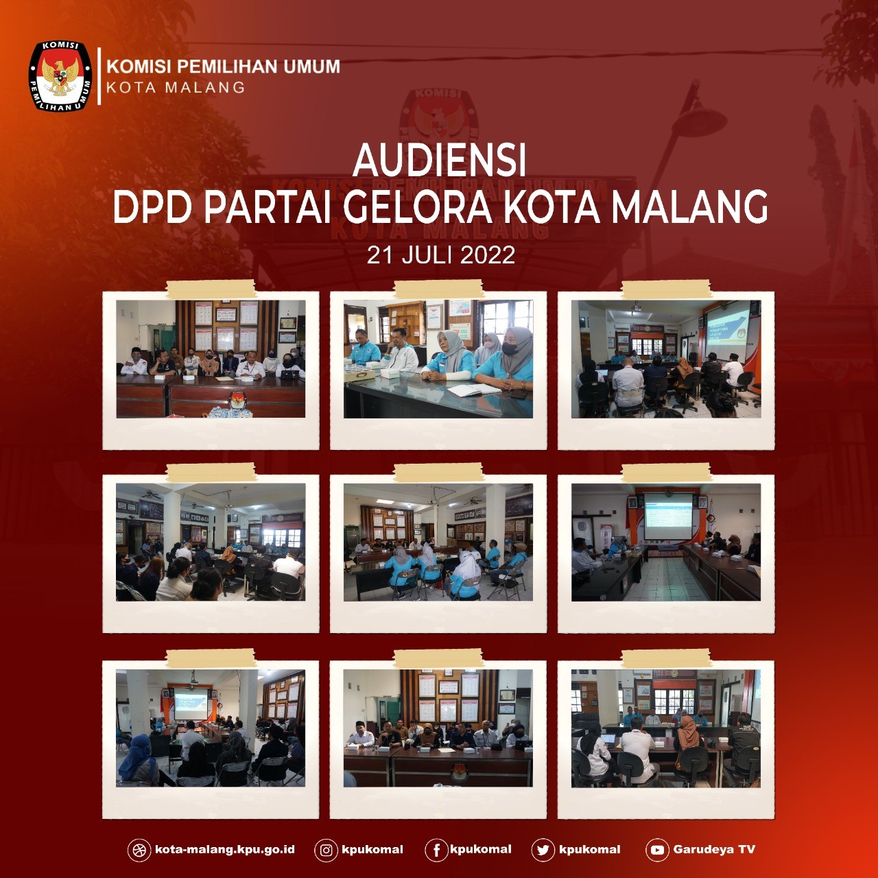 kpu.malangkota.go.id (Kamis,21/07/2022) KPU Kota Malang kembali menerima Audiensi Partai Politik Calon Peserta Pemilu Tahun 2024. Pada kesempatan kali ini, giliran Ketua DPP Partai Gelombang Rakyat Indonesia (GELORA), Sonayi beserta jajarannya hadir di kantor KPU Kota Malang. Audiensi ini dihadiri oleh Ketua KPU Kota Malang Asminah Asminingtyas, Sekretaris KPU Kota Malang Dedy Tri Wahyudi Suryo Putro, Komisioner Divisi Teknis Penyelenggaraan Pemilu, Deny Rachmat Bachtiar, Komisioner Hukum dan SDM Izzudin Fuad Fathony, Kasubbag Teknis dan Hupmas Hendrian Haswara Bayu, dan disaksikan oleh Mahasiswa magang di KPU Kota Malang. Pertemuan ini terkait Audiensi tahapan pertama pemilu yaitu tahapan pendaftaran dan verifikasi partai politik peserta pemilu tahun 2024. Kegitan ini dibuka langsung oleh Ketua KPU Kota Malang.