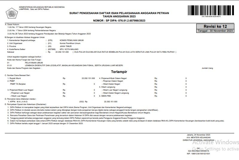 Daftar Isian Pelaksanaan Anggaran (DIPA) KPU Kota Malang Tahun 2023