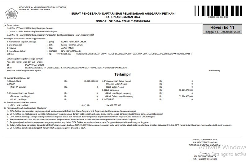 Daftar Isian Pelaksanaan Anggaran (DIPA) KPU Kota Malang Thun 2024