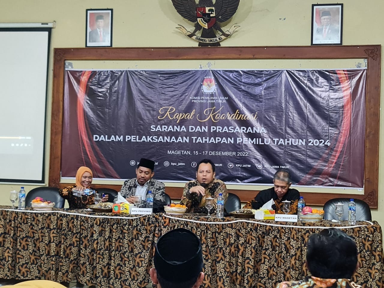 Pada Hari Kamis s.d. Sabtu Tanggal 15 s.d. 17 Desember 2022 KPU Kota Malang mengikuti Rapat Koordinasi Sarana dan Prasarana Dalam Pelaksanaan Tahapan Pemilu Tahun 2024 yang diikuti oleh Ketua, Sekretaris, dan Kasubbag Keuangan, Umum, dan Logistik seluruh KPU Kabupaten/Kota dengan KPU Provinsi Se- Jawa Timur.