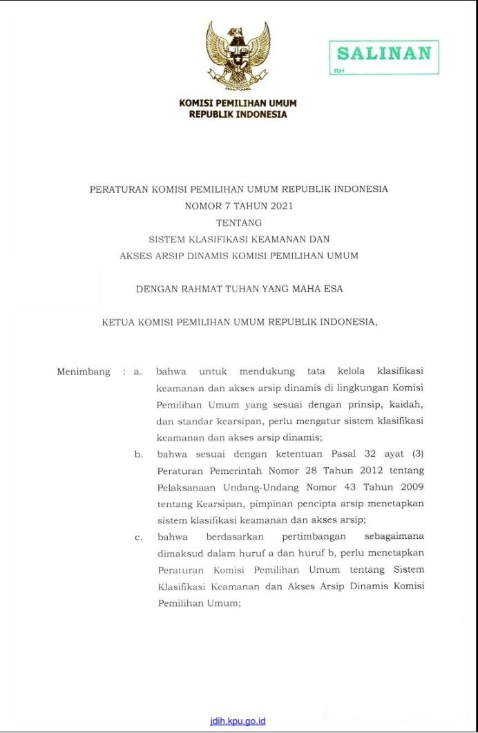 Bahwa dalam rangka mendukung tata kelola klasifikasi keamanan dan akses arsip dinamis di lingkungan KPU sesuai dengan prinsip, kaidah, dan standar kearsipan, KPU RI menetapkan Peraturan Komisi Pemilihan Umum Republik Indonesia Nomor 7 Tahun 2021 tentang Sistem Klasifikasi Keamanan dan Akses Arsip Dinamis Komisi Pemilihan Umum. Sistem klasifikasi keamanan dan Akses Arsip Dinamis di lingkungan KPU dimaksudkan untuk memberikan panduan penyusunan klasifikasi keamanan dan Akses Arsip Dinamis, melindungi fisik dan informasi Arsip Dinamis dari kerusakan dan kehilangan, menyediakan layanan informasi Arsip Dinamis kepada publik dengan prinsip cepat, tepat, murah, dan aman, menyediakan informasi yang dikategorikan terbuka dan dapat diakses oleh publik, melakukan pemberkasan Arsip Dinamis dengan tertib, mengamankan Arsip Dinamis berdasarkan kewenangan akses terhadap klasifikasi informasi Arsip yang telah ditetapkan, serta mencegah penyalahgunaan Arsip oleh pihak yang tidak berhak.
