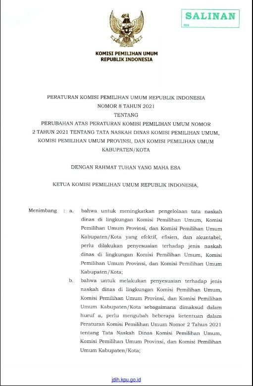 Untuk meningkatkan pengelolaan tata naskah dinas di lingkungan KPU, KPU Provinsi, dan KPU Kabupaten/Kota, agar berjalan efektif, efisien, dan akuntabel KPU RI menetapkan Peraturan Komisi Pemilihan Umum Republik Indonesia Nomor 8 Tahun 2021 tentang Perubahan atas Peraturan Komisi Pemilihan Umum Nomor 2 Tahun 2021 tentang Tata Naskah Dinas Komisi Pemilihan Umum, Komisi Pemilihan Umum Provinsi, dan Komisi Pemilihan Umum Kabupaten/Kota. KPU sebagai suatu lembaga penyelenggara Pemilu dan Pemilihan tidak dapat terpisahkan dari arsip. Arsip merupakan rekaman kegiatan atau peristiwa dalam berbagai bentuk dan media sesuai dengan perkembangan teknologi informasi dan komunikasi yang dibuat dan diterima oleh lembaga negara, pemerintahan daerah, lembaga pendidikan, perusahaan, organisasi politik, organisasi kemasyarakatan, dan perseorangan dalam pelaksanaan kehidupan bermasyarakat, berbangsa, dan bernegara. Penyusunan tata naskah dinas bertujuan untuk mendukung pengelolaan arsip yang efektif dan efisien, tertib administrasi, meningkatkan pelayanan publik, melancarkan kegiatan, dan untuk melancarkan komunikasi kedinasan yang efektif dan efisien di lingkungan KPU, KPU Provinsi, dan KPU Kabupaten/Kota. Penetapan Peraturan KPU Nomor 8 Tahun 2021 juga merupakan bentuk penyesuaian terhadap beberapa jenis tata naskah dinas yang sebelumnya diatur dalam Peraturan KPU Nomor 2 Tahun 2021.