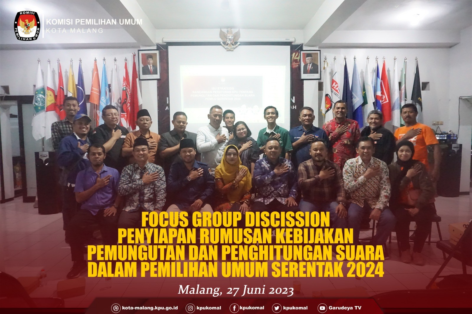 Malang, Selasa (27/06/2023), bertempat di Jalan Bantaran 6 Malang, KPU Kota Malang gelar Focus Group Discussion (Fgd) Penyiapan Rumusan Kebijakan Pemungutan Dan Penghitungan Suara Dalam Pemilu Serentak Tahun 2024.