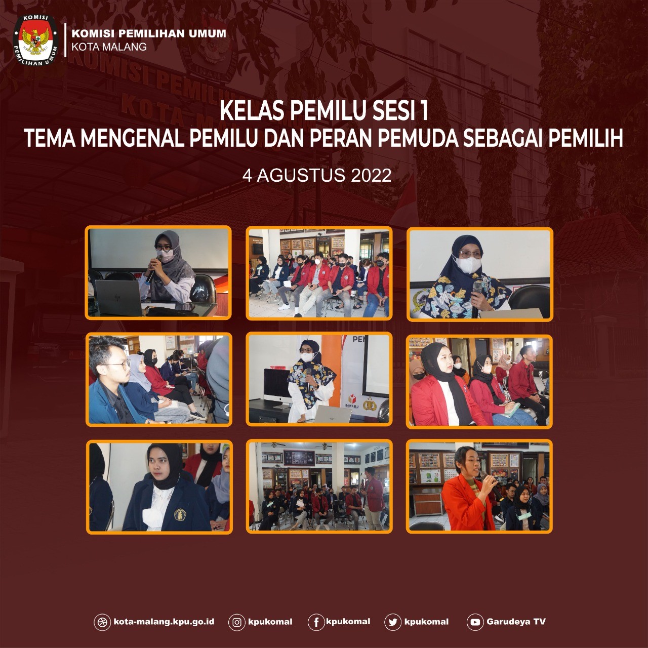 kpu.malangkota.go.id. (4/8/2022). Dalam rangka meningkatkan pengetahuan kepemiluan, KPU Kota Malang kembali mengadakan Kelas Pemilu bagi mahasiswa dan mahasiswi magang/praktek kerja lapangan (PKL) di KPU Kota Malang. Kegiatan yang bertemakan Pemilu dan Demokrasi tersebut diselenggarakan di Aula Kantor KPU Kota Malang, Kamis 4 Agustus 2022, yang dimulai pukul 09.00-15.00 WIB. Kelas pemilu hari pertama ini diikuti oleh 21 mahasiswa magang dari beberapa universitas baik universitas negeri maupun swasta di kota malang, seperti Universitas Brawijaya, Universitas, Muhamadiyah Malang, Universitas Merdeka Malang, Universitas 17 Agustus 1945 Surabaya, dan STIE Malang Kucecwara.