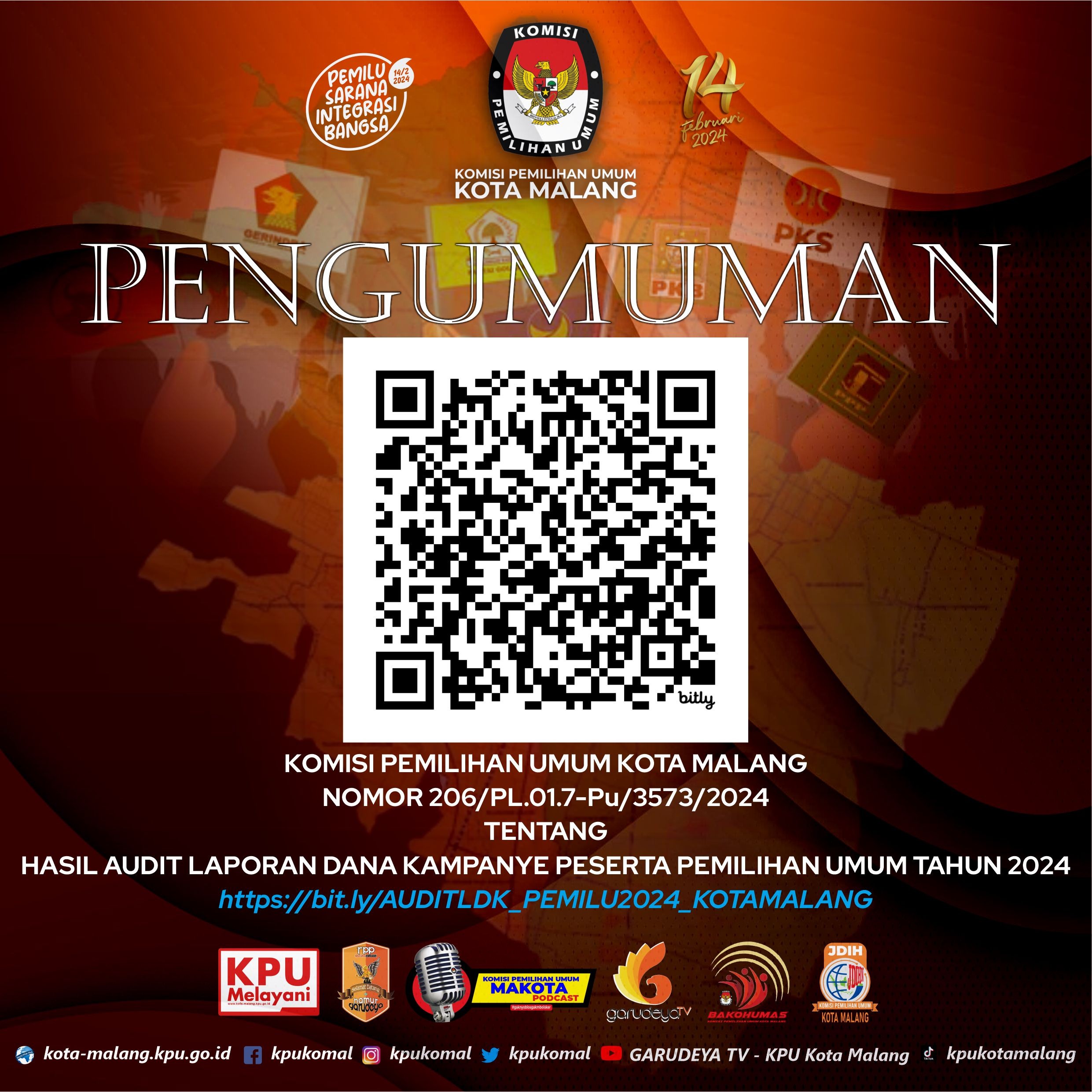 Hai #temanpemilih ... Berikut disampaikan Pengumuman Komisi Pemilihan Umum Kota Malang Nomor 206/PL.01.7-Pu/3573/2024 tentang Hasil Audit Laporan Dana Kampanye Peserta Pemilihan Umum tahun 2024.