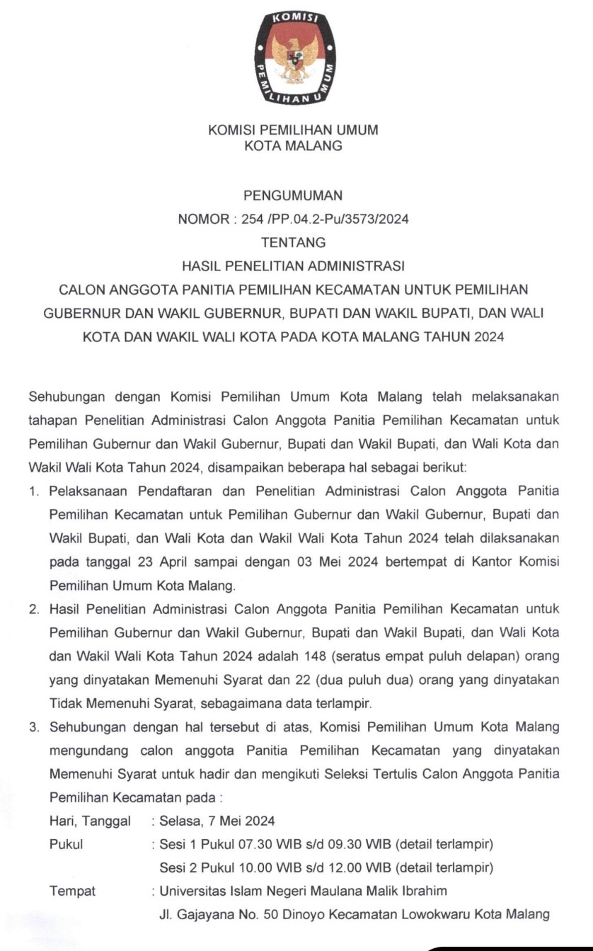 Hasil Penelitian Administrasi Seleksi PPK Pilkada 2024 Kota Malang
