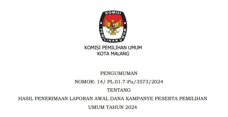 HASIL PENERIMAAN AWAL DANA KAMPANYE PESERTA PEMILIHAN UMUM TAHUN 2024 KOTA MALANG DAPAT DIUNDUH DITAUTAN BERIKUT INI :