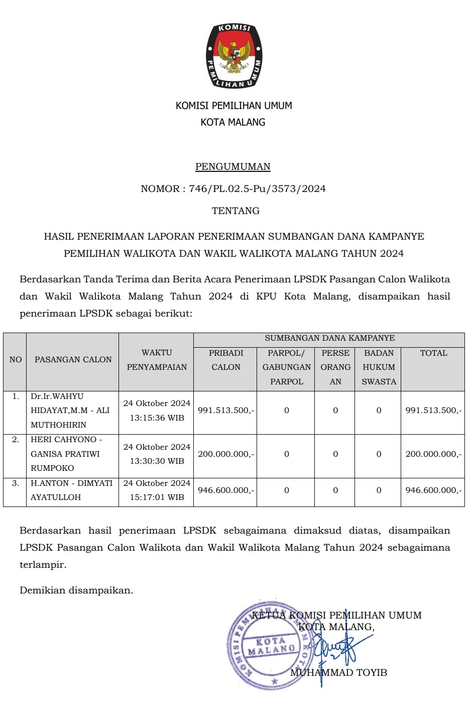 Hasil Penerimaan Laporan Dana Kampanye Paslon Pilkada 2024