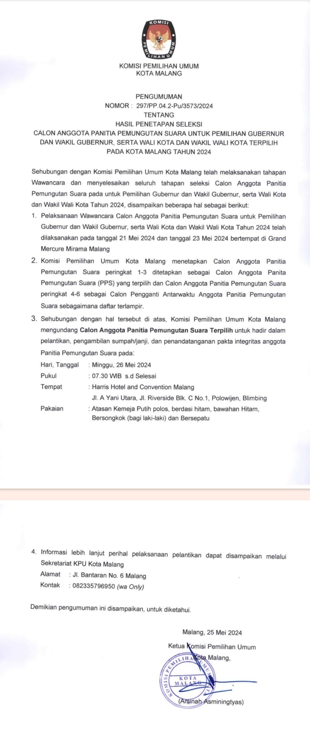 Hasil Penetapan Seleksi Calon Anggota PPS Pilkada Serentak Kota Malang Tahun 2024