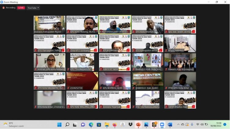 Pada Hari Kamis Tanggal 18 Agustus 2022, KPU Kota Malang mengikuti Pembukaan Kegiatan Bimbingan Teknis Monitoring dan Evaluasi Badan Publik di Jawa Timur. Kegiatan tersebut diselenggarakan oleh Komisi Informasi Provinsi Jawa Timur secara daring mulai Pukul 08.30 WIB.