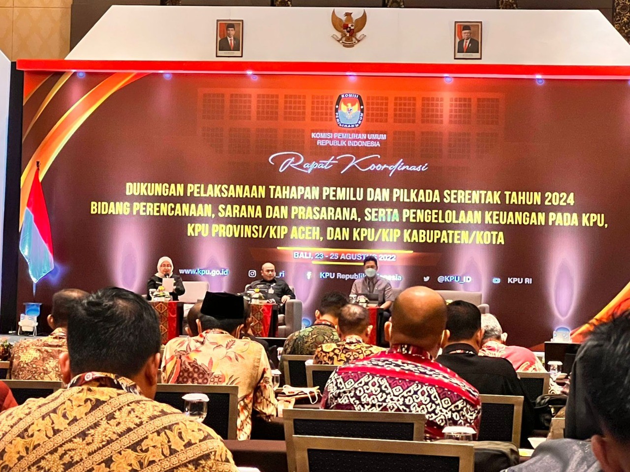 Komisi Pemilihan Umum (KPU) Kota Malang menghadiri Rapat Koordinasi Dukungan Pelaksanaan Tahapan Pemilu dan Pilkada Serentak Tahun 2024 Bidang Perencanaan Sarana dan Prasarana, Serta Pengelolaan Keuangan Pada KPU, KPU Provinsi/KIP Aceh dan KPU/KIP Kabupaten/Kota pada Hari Selasa sampai dengan Kamis Tanggal 23 sampai dengan 25 Agustus 2022. Bertempat di Gedung Pertemuan Bali Nusa Dua Convention Center Kawasan Pariwisata Nusa Dua Lot Benoa, Kecamatan Kuta Selatan Kabupaten Badung, Bali.