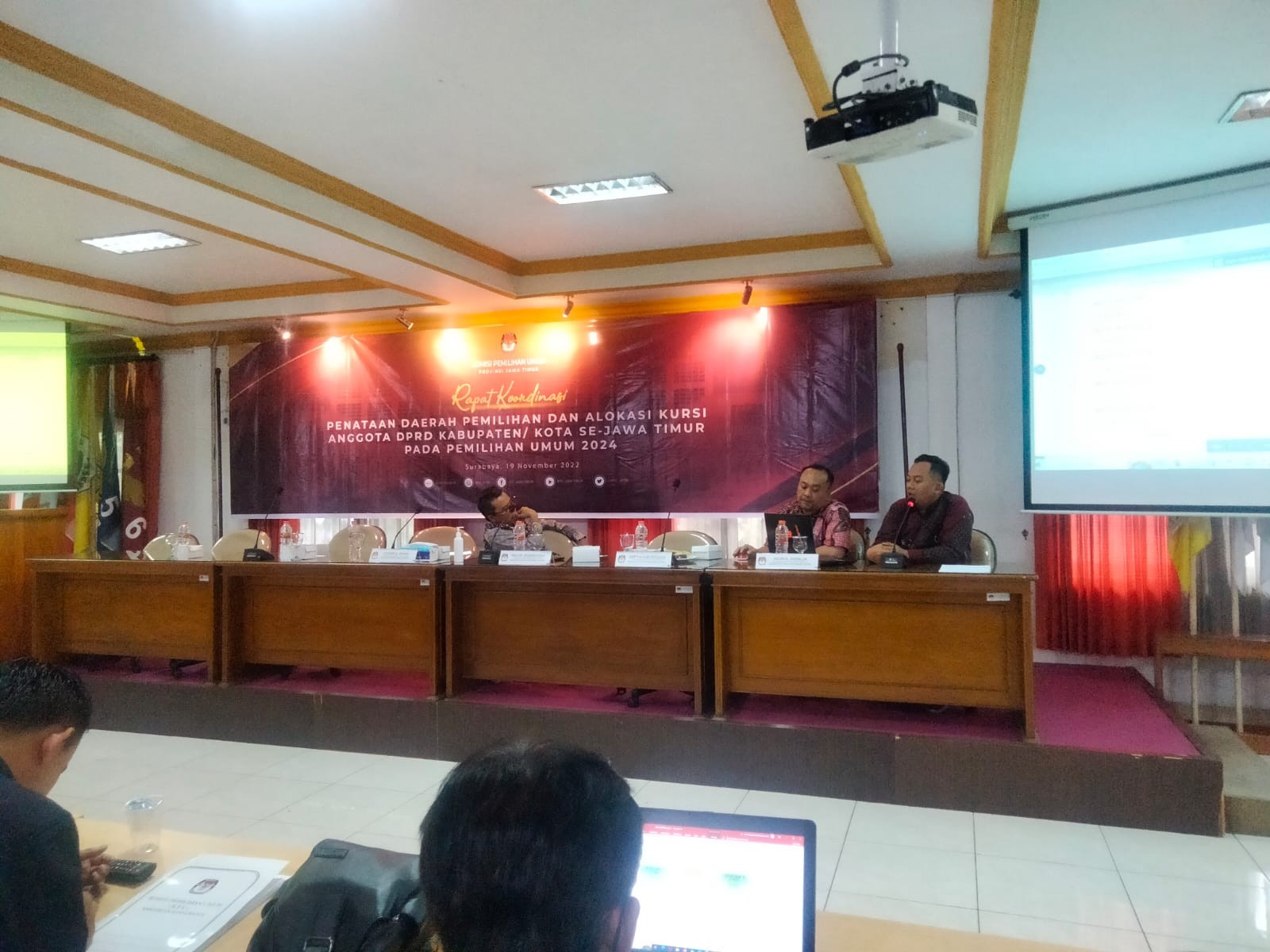 Sebelum kegiatan rakor dimaksud, KPU Provinsi Jawa Timur meminta KPU Kabupaten/Kota untuk melakukan analisa dan kajian terhadap penataan daerah pemilihan dan alokasi kursi Anggota DPRD Kabupaten/Kota untuk Pemilihan Umum tahun 2024.