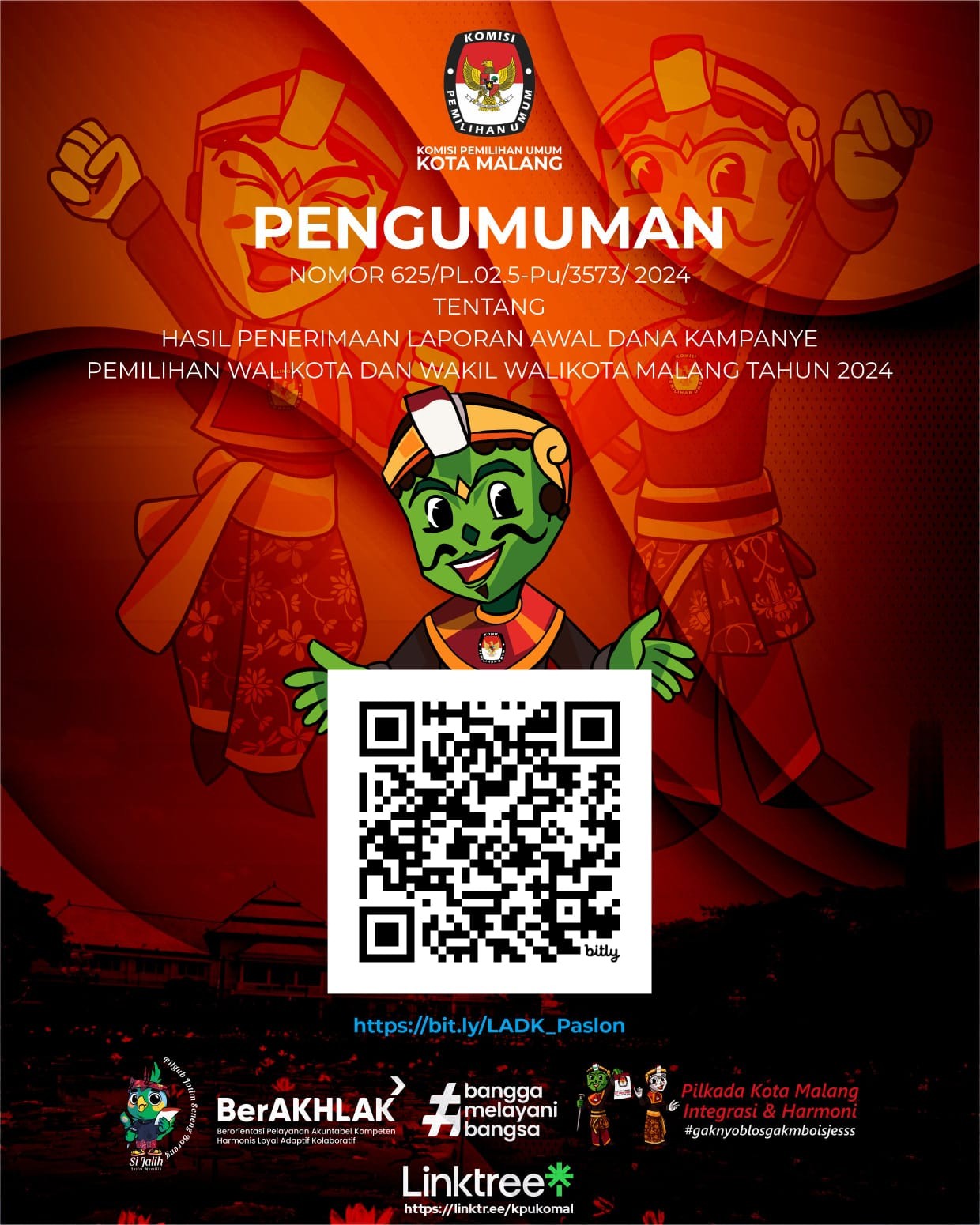 Hai #temanpemilih ... Komisi Pemilihan Umum Kota Malang melalui Pengumuman menyampaikan Laporan Awal Dana Kampanye dan Laporan Awal Dana Kampanye Perbaikan Pemilihan Walikota dan Wakil Walikota Malang Tahun 2024 yang dapat diakses dengan cara scan QR Code tercantum atau klik tautan berikut berikut https://bit.ly/LADK_Paslon atau https://LADK_Perbaikan_Paslon
