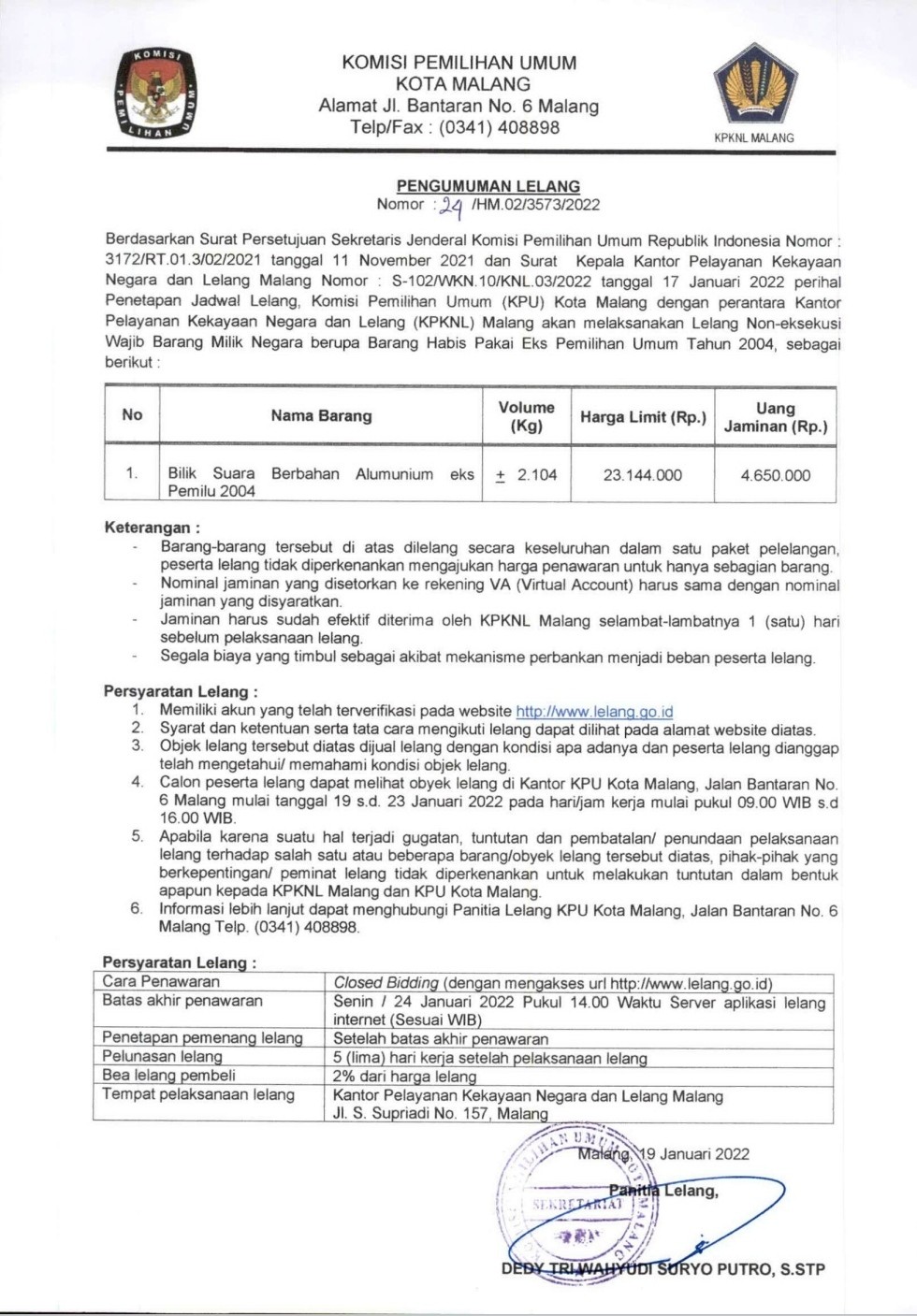 Lelang Bilik Suara KPU Kota Malang