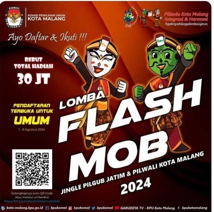 Dalam rangka Sosialisasi dan menyemarakkan Pesta Demokrasi mendatang Komisi Pemilihan Umum Kota Malang menyelenggarakan Lomba Flashmob Jingle Pilgub Jatim & Pilwali Kota Malang 2024. Rebut total hadiah sebesar 30 Jt, segera daftarkan kelompok/tim mu untuk mengikutinya...