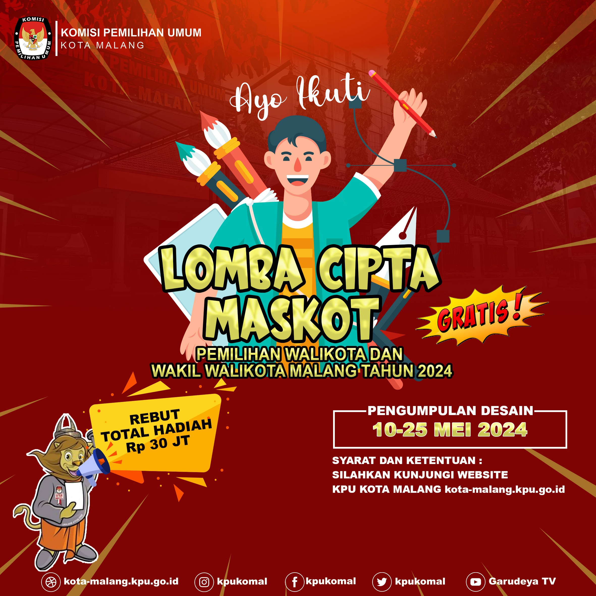 Ayo teman pemilih berkontribusi dalam membuat maskot untuk PILKADA KOTA MALANG Tahun 2024 informasi lengkap dapat di unduh di tautan berikut ini Link Pendaftaran