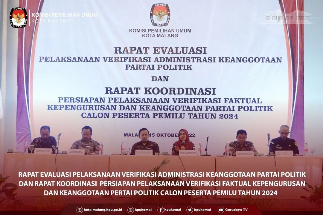 kpu.malang.go.id. Sabtu (15/10/2022) Dalam rangka persiapan Verifikasi Faktual Kepengurusan dan Keanggotaan Partai politik Calon Peserta Pemilu Tahun 2024, KPU Kota Malang menggelar Rapat Evaluasi Pelaksanaan Verifikasi Administrasi Keanggotaan dan Rapat Koordinasi Persiapan Verifikasi Faktual Kepengurusan dan Keanggotaan Partai Politik Calon Peserta Pemilu Tahun 2024. Acara ini diselenggarakan di Harris Hotel and Conventions Malang.