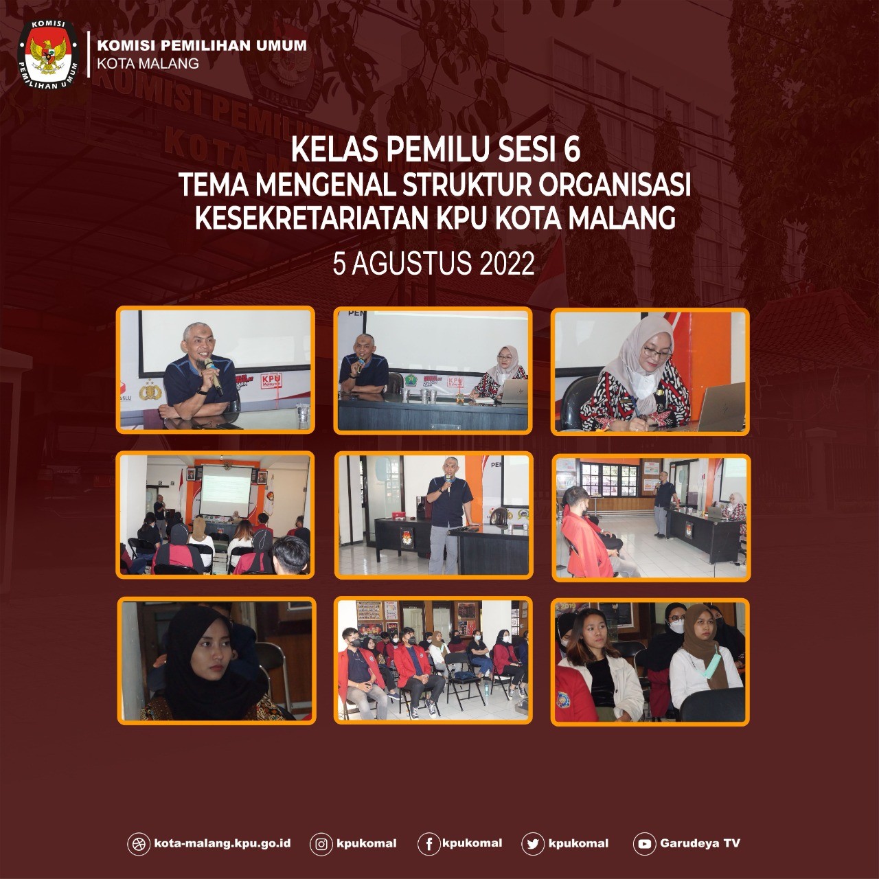 kpu.malangkota.go.id.. Pada hari Jumat, (5/8/2022) KPU kota Malang kembali menyelenggarakan kelas pemilu angkatan ke sepeluh hari kedua. Kelas pemilu di hari ke dua ini dimulai, pukul 08.30 bertempat di aula KPU Kota Malang, yang di ikutioleh 19 orang mahasiswa magang dari beberapa universitas seperti, Universitas Brawijaya, Universitas Muhamadiyah Malang, Universitas Merdeka Malang, Universitas 17 Agustus 1945 Surabaya, Dan STIE Malangkucecwaraabm Malang.