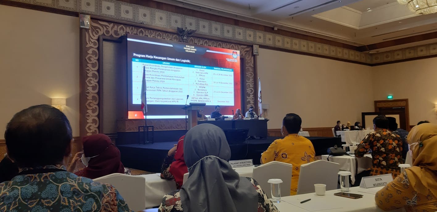 Pada hari pertama Rapat Koordinasi Pengelolaan Anggaran Dalam Rangka Pelaksanaan Anggaran Tahapan Pemilu 2024 yang diselenggarakan oleh KPU Provinsi Jawa Timur di Ballroom C Hotel Shangri-La, Jl. Mayjen Sungkono No.120, Surabaya, Kepala Biro Keuangan dan BMN KPU Yayu Yuliani menyampaikan materi Tata Kelola Keuangan Terkait Pelaksanaan Anggaran Belanja Tahapan Pemilu 2024.