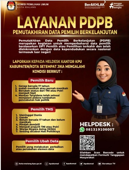 Halo warga Kota Malang, KPU Kota Malang sedang melaksanakan pemutakhiran Data Pemilih Berkelanjutan untuk memastikan seluruh Warga Negara Indonesia khususnya warga Kota Malang yang memenuhi syarat dapat menggunakan hak pilihnya pada pemilu/pemilihan mendatang.