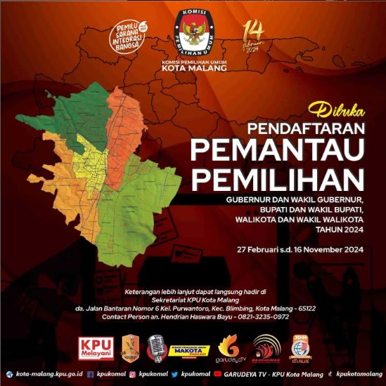 Pendaftaran Pemantau dimulai dari tanggal 27 Februari sampai dengan 16 November 2024. Keterangan lebih lanjut datang langsung ke Sekretariat KPU Kota Malang di Jalan Bantaran Nomor 6 Kel. Purwantoro, Kec. Blimbing, Kota Malang 65122 atau menghubungi nomor Contact Person yang tertera.