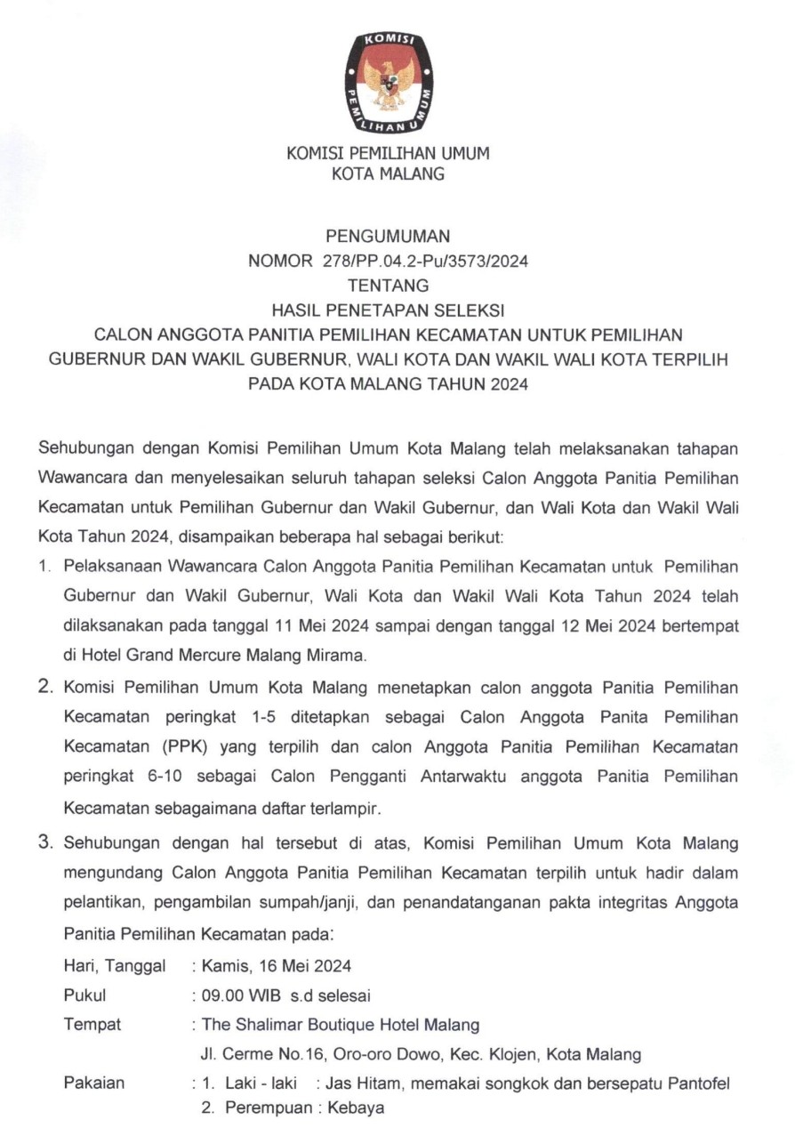 Pengumuman Hasil Penetapan Seleksi PPK Pilkada Serentak Kota Malang Tahun 2024