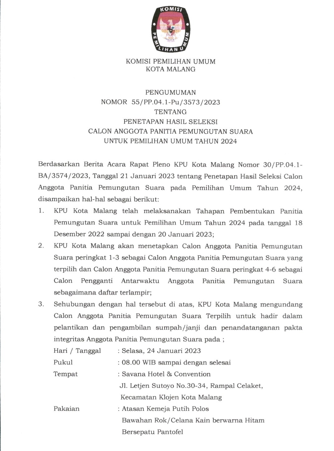 Pengumuman Hasil Seleksi Calon PPS Pemilu 2024