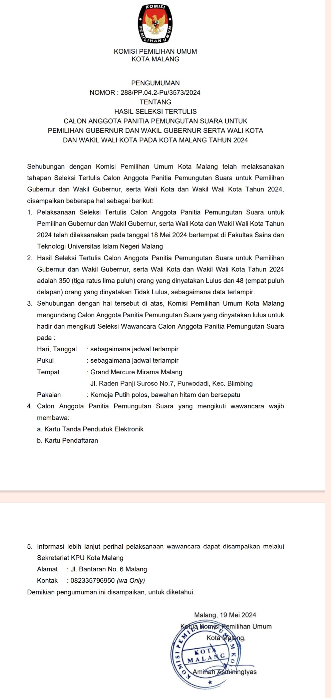 Informasi lengkap tentang Pengumuman Jadwal Wawancara dan Nama nama yang lulus test CAT PPS Pilkada Serentak Kota Malang Tahun 2024 dapat di Unduh Di tautan berikut ini Unduh Disini
