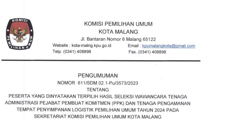 PENGUMUMAN HASIL SELEKSI WAWAN CARA ADM PPK DAN PETUGAS GUDANG LOGISTIK KPU KOTA MALANG