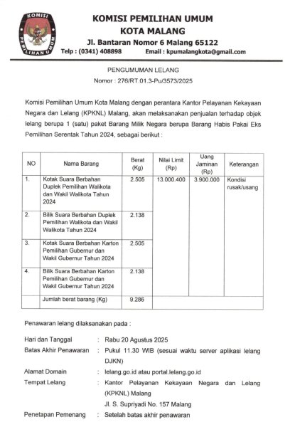 Pengumuman Lelang Barang Milik Negara Habis Pakai Eks Pemilihan Serentak Tahun 2024