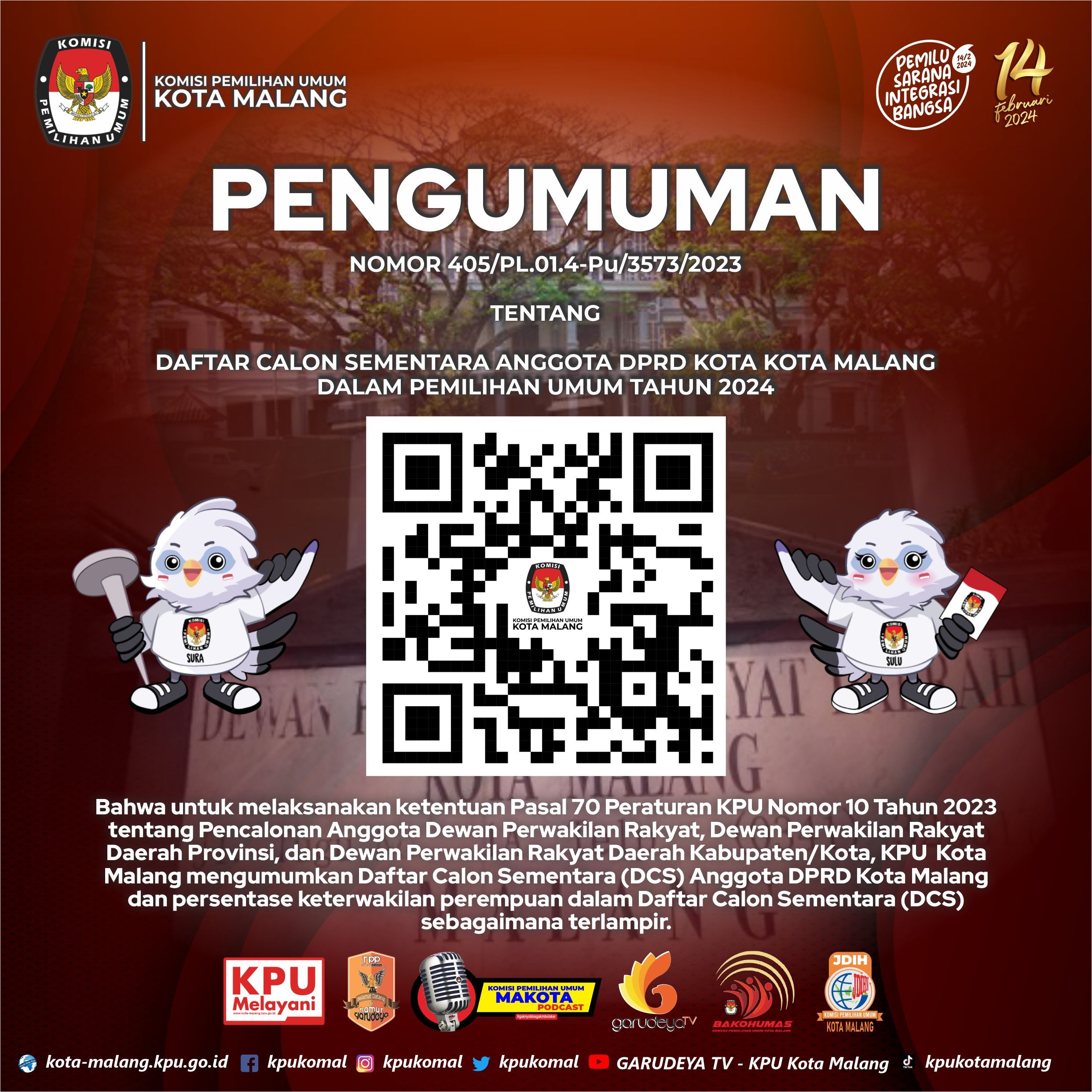 PENGUMUMAN NOMOR 405/PL.01.4-Pu/3573/2023 TENTANG DAFTAR CALON SEMENTARA ANGGOTA DPRD KABUPATEN/KOTA KOTA MALANG DALAM PEMILIHAN UMUM TAHUN 2024