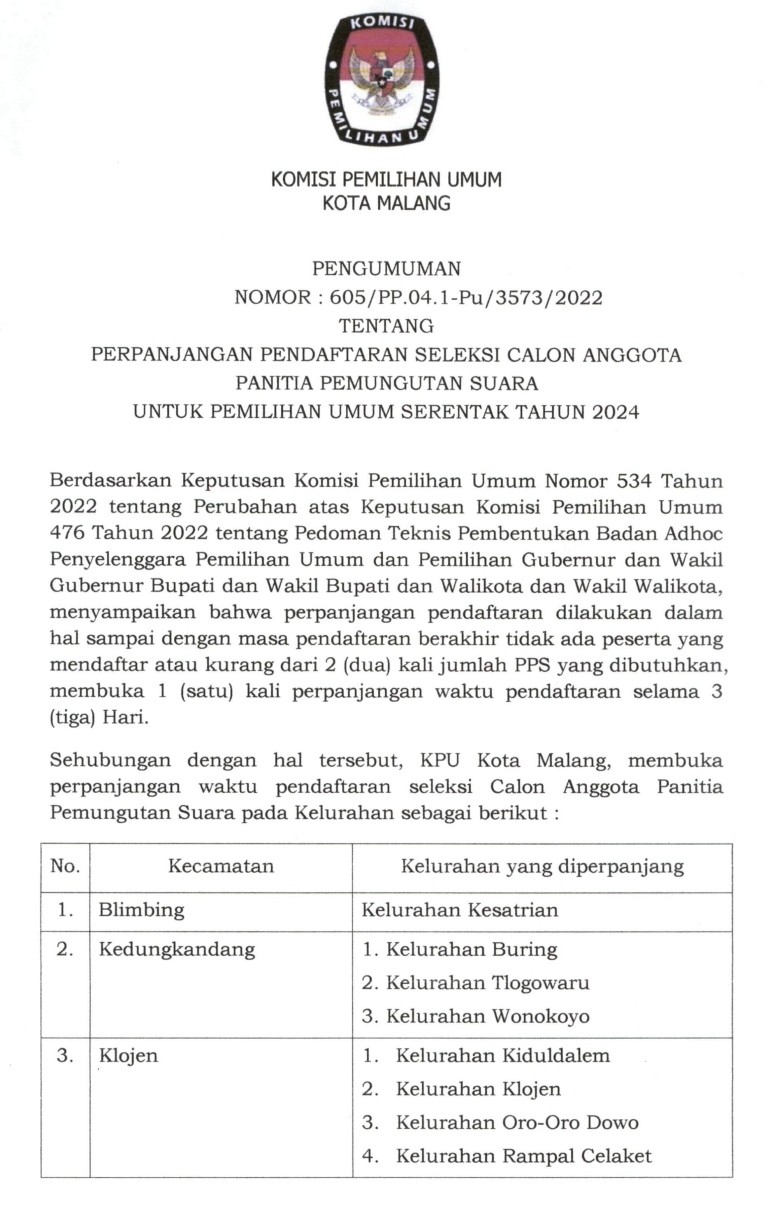 Informasi pengumuman perpanjangan pendaftaran PPS Pemilu 2024 dapat di unduh di tautan berikut: