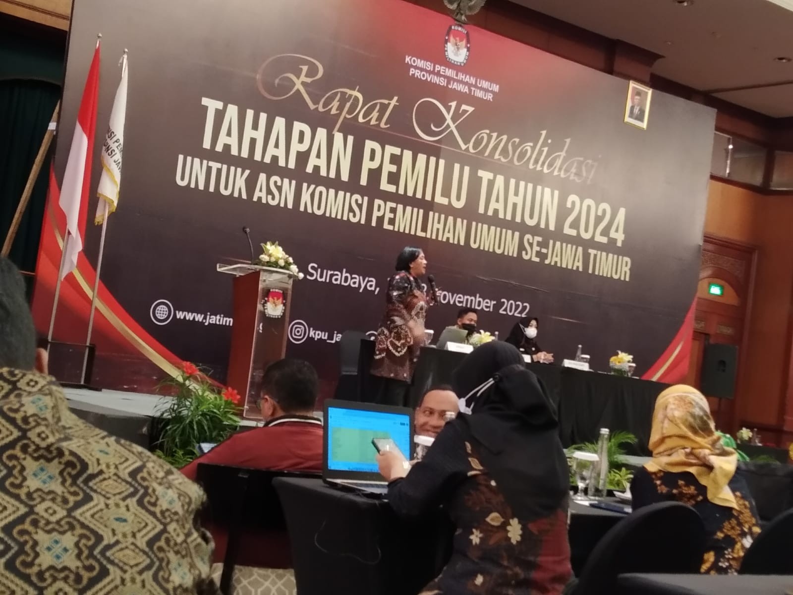 Surabaya- Adanya Kode etik dan kode perilaku bertujuan untuk menjaga martabat dan kehormatan ASN, ungkap rochani Divisi SDM & Litbang KPU Provinsi Jawa Timur dalam paparan materi pada kegiatan Rapat Konsolidasi Tahapan Pemilu Tahun 2024 Untuk ASN Komisi Pemilihan Umum Se-Jawa Timur.