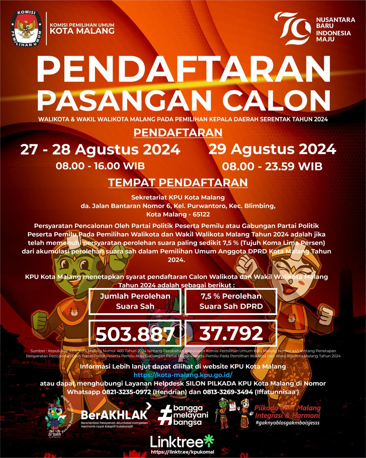 Hai #temanpemilih ... Berdasarkan Keputusan KPU Kota Malang Nomor 460 Tahun 2024 tentang Perubahan Keputusan Komisi Pemilihan Umum Kota Malang Nomor 445 tentang Penetapan Persyaratan Pencalonan Oleh Partai Politik Peserta Pemilu Atau Gabungan Partai Politik Peserta Pemilu Pada Pemilihan Walikota Dan Wakil Walikota Malang Tahun 2024 menyatakan syarat minimal suara sah 37.792 (Tiga Puluh Tujuh Ribu Tujuh Ratus Sembilan Puluh Dua).