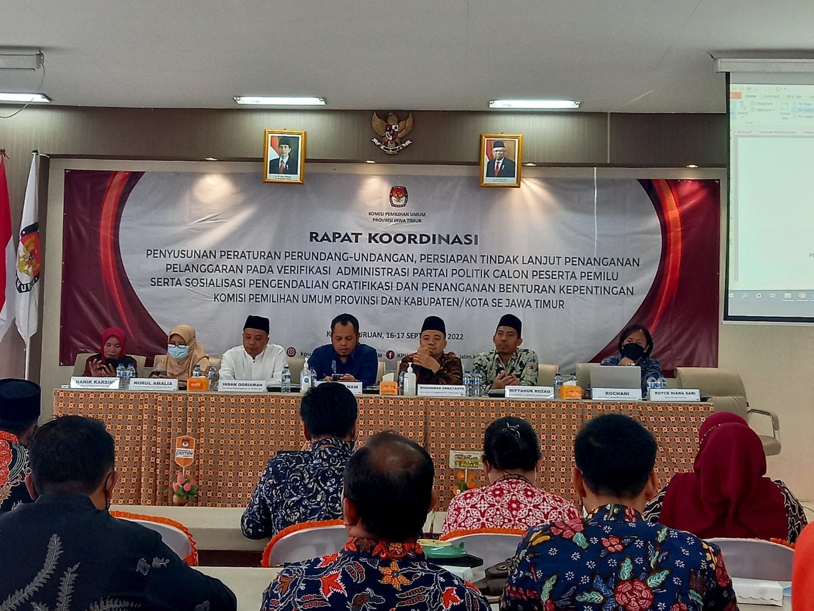 KPU Kota Malang Mengikuti Rapat Koordinasi Penyusunan Peraturan Perundang-Undangan, Persiapan Tindak Lanjut Penanganan Pelanggaran Pada Verifikasi Administrasi Partai Politik Calon Peserta Pemilu Serta Sosialisasi Pengendalian Gratifikasi dan Penangan Benturan Kepentingan KPU Prov Jatim dan Kabupaten/Kota se-Jatim, di aula KPU Kota Pasuruan, Jumat-Sabtu, (16-17/9/2022)