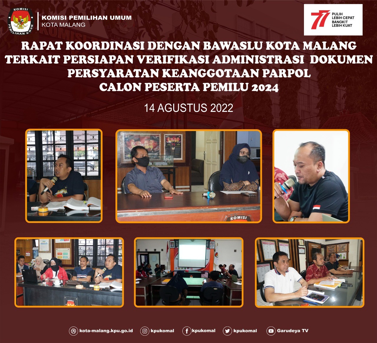 kpu.malangkota.go.id. Hari minggu (14/8/2022) KPU Kota Malang mengadakan Rapat Koordinasi Persiapan Verifikasi Parpol Calon Peserta Pemilu Tahun 2024 dengan Bawaslu Kota Malang. Kegiatan ini dilaksanakan sebagai langkah koordinasi sekaligus penyamaan persepsi antara Penyelenggara Pemilu di tingkat Kota Malang dalam menyongsong tahapan verifikasi administrasi Parpol Calon Peserta Pemilu Tahun 2024 melalui SIPOL yang akan dilakukan oleh KPU Kota Malang pada tanggal 16 Agustus sampai dengan tanggal 29 Agustus mendatang. Acara ini dimulai tepat pukul 16.00 WIB dan dibuka oleh Ketua KPU Kota Malang, Aminah Asminingtyas.