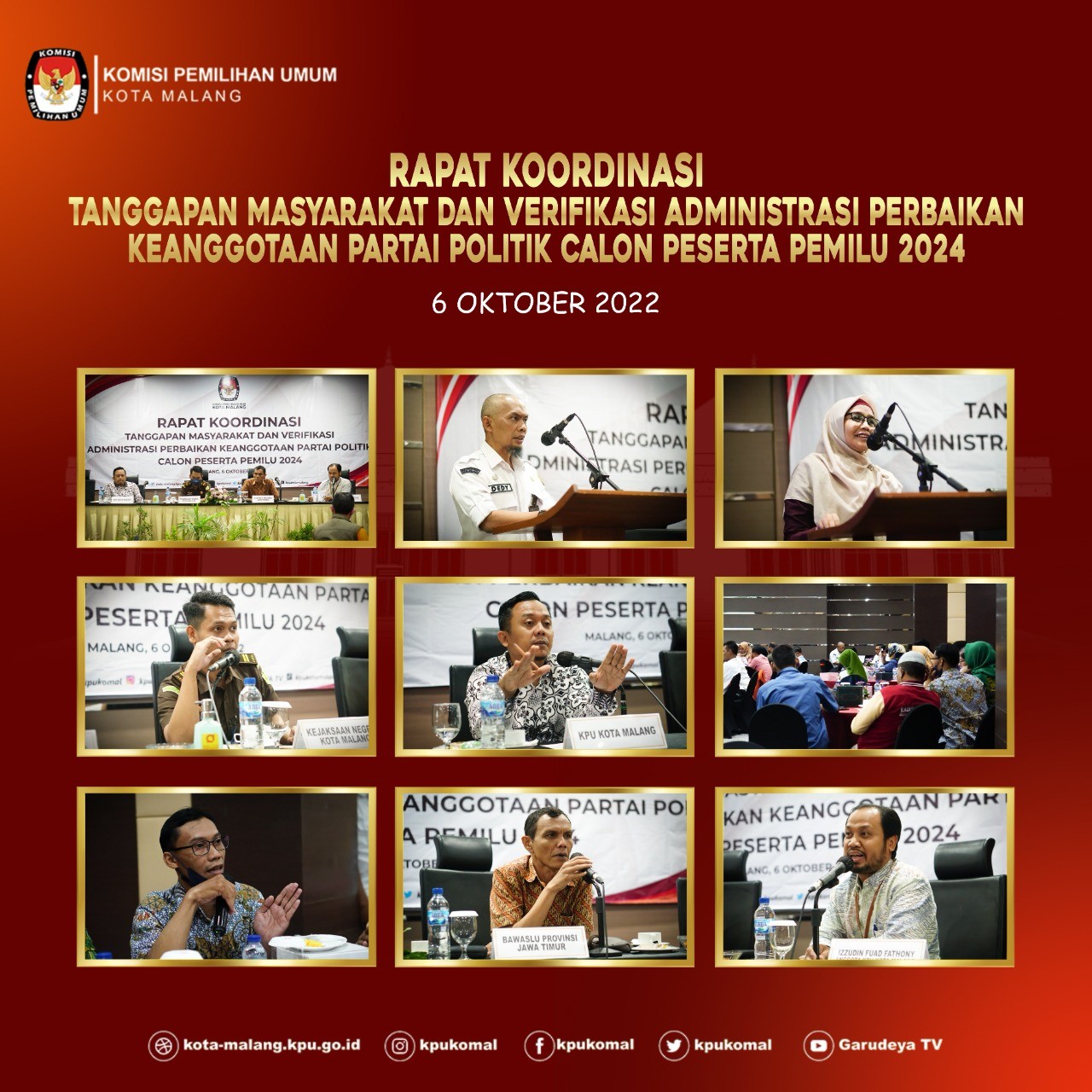 Malang-Kamis (6/10/22).KPU Kota Malang melakukan Rapat Koordinasi Tanggapan Masyarakat dan Verfikasi Administrasi Perbaikan Keanggotaan Partai politik Calon Peserta Pemilu 2024 yang dihadiri oleh oleh Komisioner KPU Kota Malang,Sekretaris KPU Kota Malang,Staff Sekretariat KPU Kota Malang,Kejaksaan Negeri Kota Malang,Bakesbangpol Kota Malang,Bawaslu Provinsi Jawa Timur dan Bawaslu Kota Malang dan 22 Partai politik.