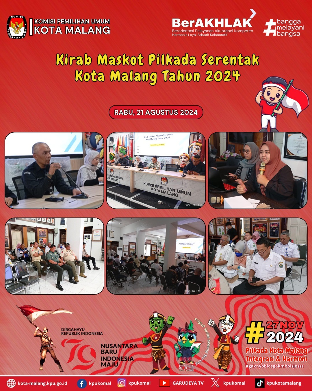 Hai #temanpemilih Kota Malang... Jangan lupa datang dan saksikan Kirab Maskot Pilkada Serentak Tahun 2024 pada Sabtu (24/08/2024) mulai pukul 12.00 WIB - Selesai di Lapangan Brawijaya Rampal Kota Malang.