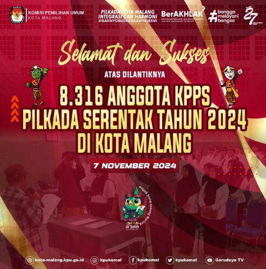 #TemanPemilih segenap jajaran KPU Kota Malang mengucapkan selamat dan sukses atas dilantiknya 8.316 Anggota KPPS Pilkada Serentak tahun 2024 di Kota Malang. Semoga dapat menjalankan tugas dengan penuh tanggungjawab.