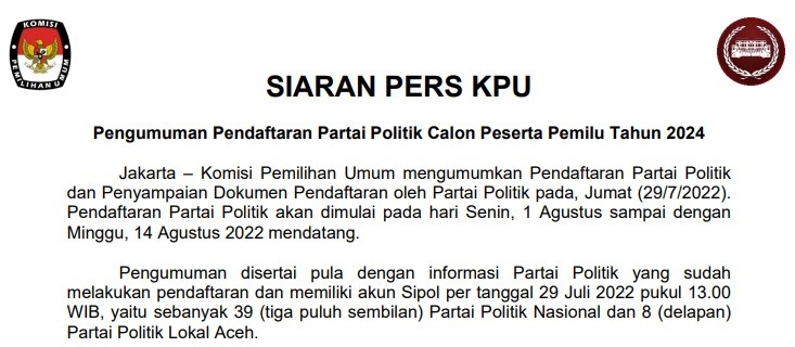 Siaran Pers KPU terkait Pengumuman Pendaftaran Partai Politik Calon Peserta Pemilu Tahun 2024