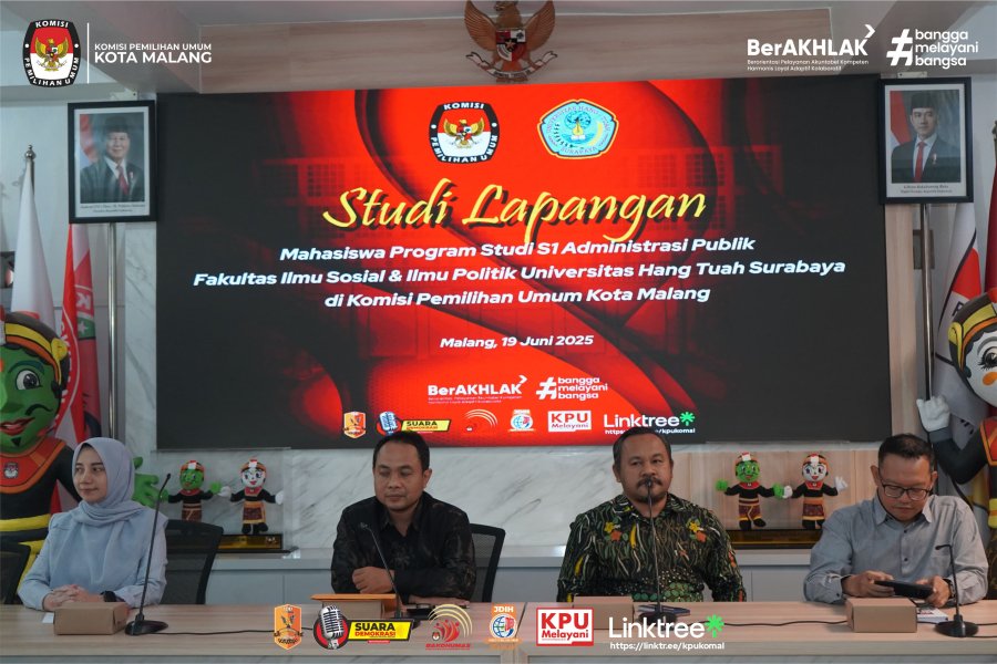 KOTA MALANG, kota-malang,kpu.go.id - KPU Kota Malang pada hari Kamis, 19 Juni 2025 menerima kunjungan Studi Lapangan 48 Mahasiswa Program Studi S1 Administrasi Publik, FISIP Universitas Hang Tuah Surabaya.